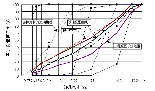注意:各个料仓的筛分结果应按本规范的取样方法定期检测,施工过程中应经常检查是否有大的变化,利用新的筛分结果计算矿料级配,必要时适当调整配合比的设定值,以确保符合实际情况,达到标准配合比的要求。